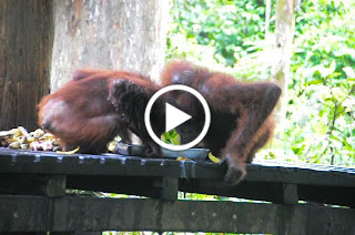 Als der Wärter mit dem Essen kam, saßen die beiden jedoch ganz einträglich nebeneinander und ließen sich von nichts beim Essen stören. Leider drehten sie uns dabei zumeist den Rücken zu, sodass wir sie nur bedingt beobachten konnten. Der kleinere der beiden hatte immer wieder Probleme mit Insekten, die ebenfalls an seinem Essen interessiert waren, und versuchte mehrfach, sie an der Plattform abzustreichen. Immer wieder betrachtete er dabei zunehmend genervter wirkend seine Hände von beiden Seiten, was uns sehr an menschliche Handlungen erinnerte. Nach dem Essen gab es noch eine Schale Milch und danach verzogen sich beide wieder in die Baumwipfel: für uns das Zeichen, unseren kleinen Rundweg durch das geschützte Dschungelgebiet zum Ausgang fortzusetzen, unsere Rucksäcke zu holen und in den letzten und dafür vollgepackten Bus zurück in die Stadt zu steigen, der die ganze Fahrt über laut Nirvana und andere Hymnen verklingen ließ. Wären wir nicht so müde gewesen, von so viel prall gefüllter und umwerfender Dschungelzeit, hätten wir sicherlich laut mitgesungen! Für die anderen Autofahrer und Fußgänger waren wir jedenfalls eine kleine, aber dafür sehr laute Attraktion... ;-)