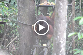 Richie fraß die ganze Zeit mit Blick zum Publikum, das sich auf der Brücke ein wenig zerstreut hatte und nun auch langsam begann, die anderen Orang Utans zu beobachten, die die Seile in luftigen Höhen dem Straßenboden vorzogen und gleich zu vielen herankamen, sich jedoch weiter in den Bäumen aufhielten, bis Richie, nicht ohne die Ranger und Touristen noch einmal in Aufregung zu versetzen, die Plattform schließlich freigab. Dass wir Richie zu Gesicht bekommen haben, sei übrigens auch richtiges Glück gewesen, denn er zeige sich, wie erwähnt, sehr selten zur Fütterung und versorge sich lieber selbst mit Früchten direkt von den Bäumen. :-)